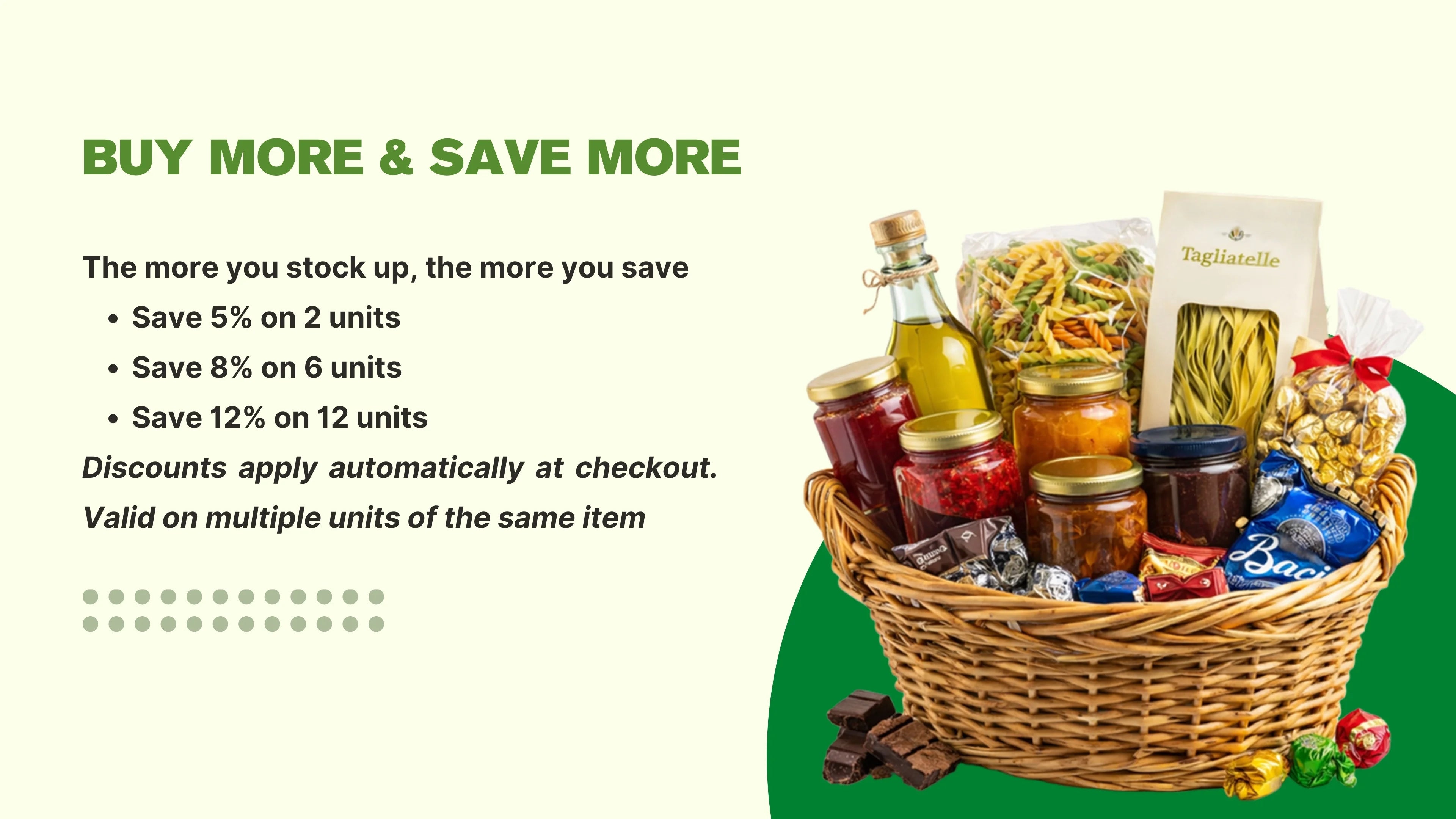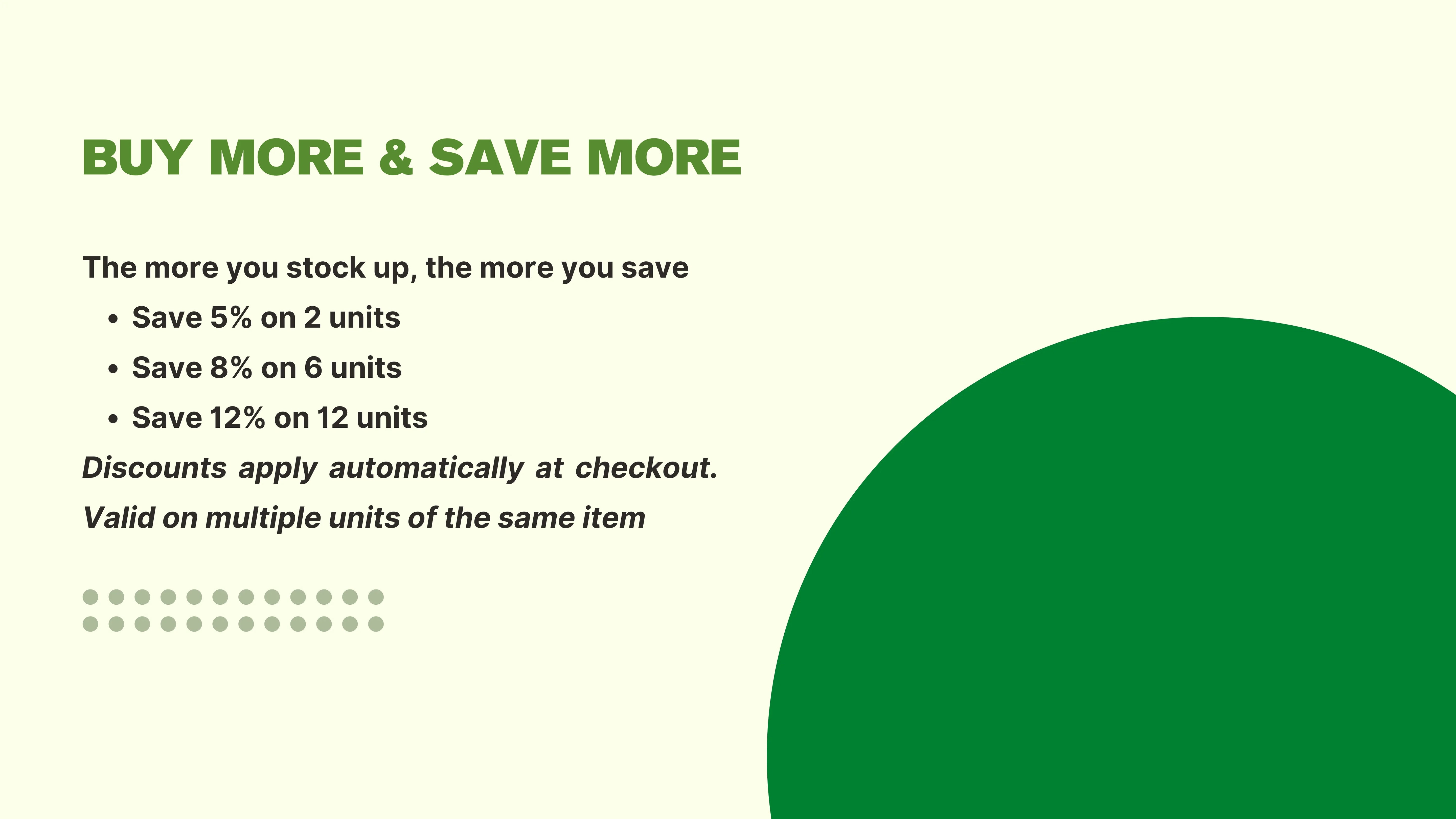 Discounts apply automatically at checkout. Valid on multiple units of the same item
