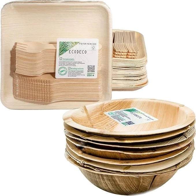 8-Inch Square Palm Leaf Plates with Wooden Cutlery & Large Serving Bowls – Eco-Friendly Disposable Party Set